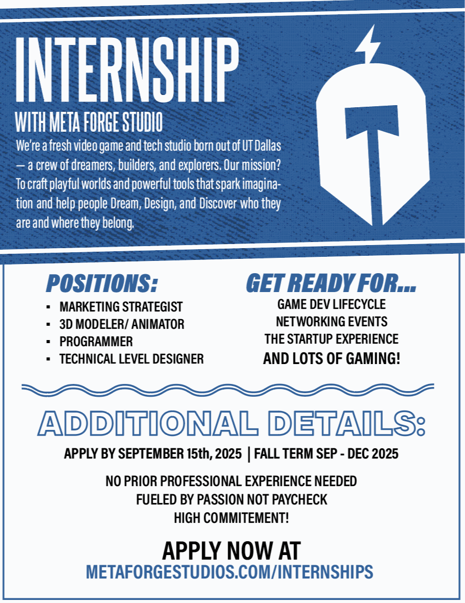We’re thrilled to announce Meta Forge Studio’s first-ever Internship Program, open exclusively to UT Dallas students! This is your opportunity to gain hands-on experience in the video game industry while contributing to exciting projects that bring worlds to life.